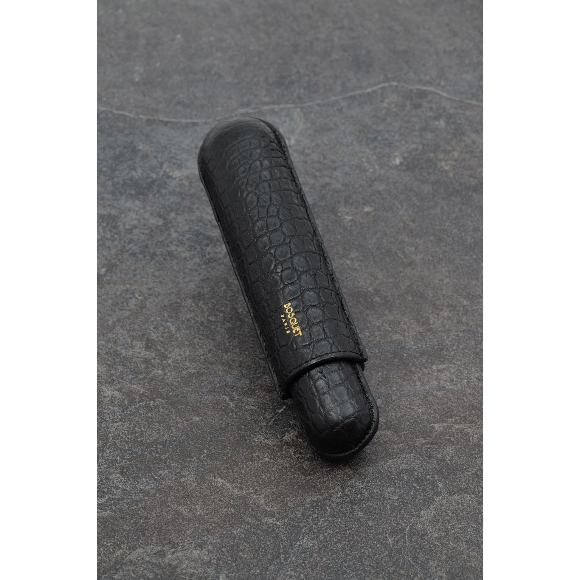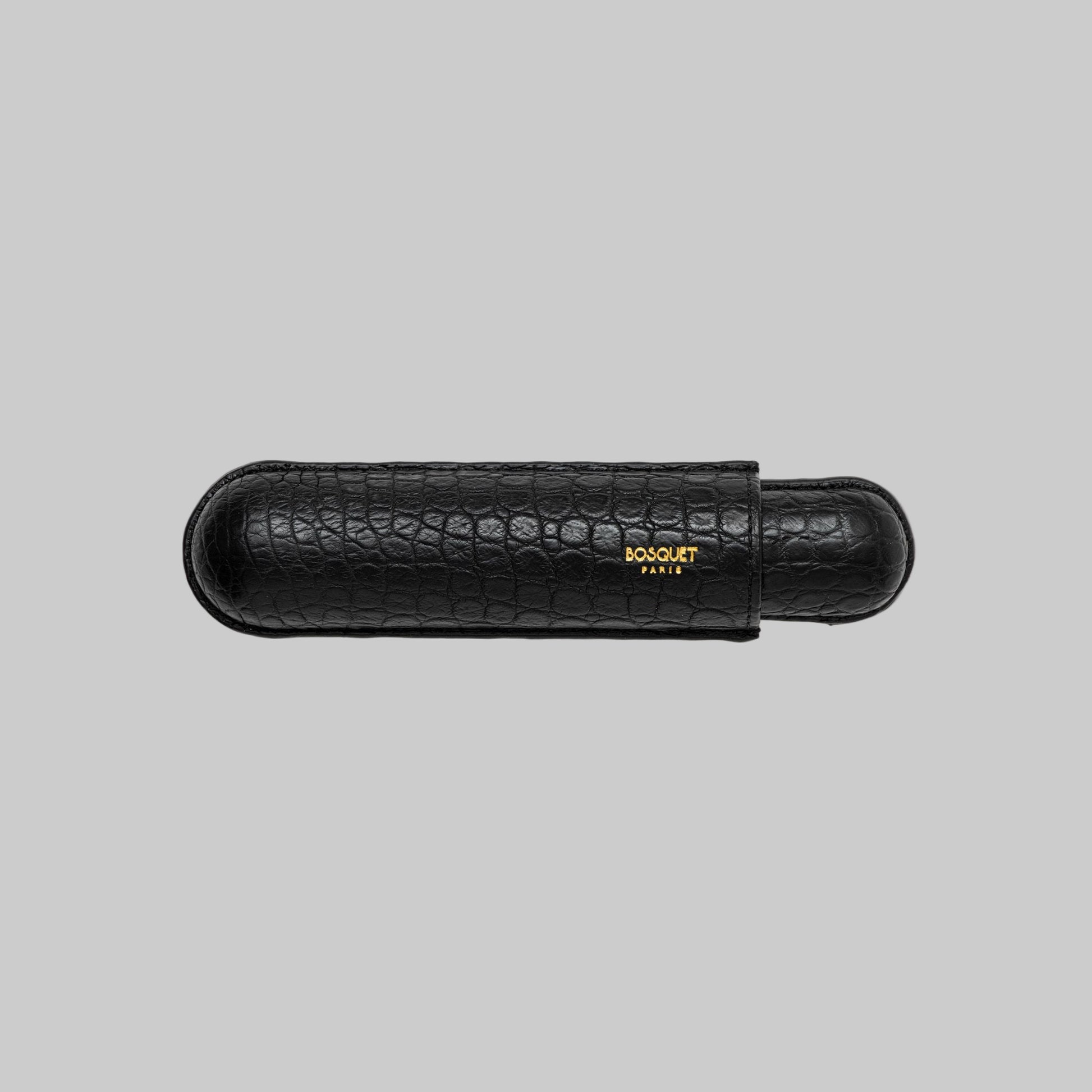 This elegant cigar case is handcrafted from genuine crocodile skin in a classic silhouette. The chic design is complete with a 22 Carat gold Bosquet Paris signature for an ultra-luxe finish.